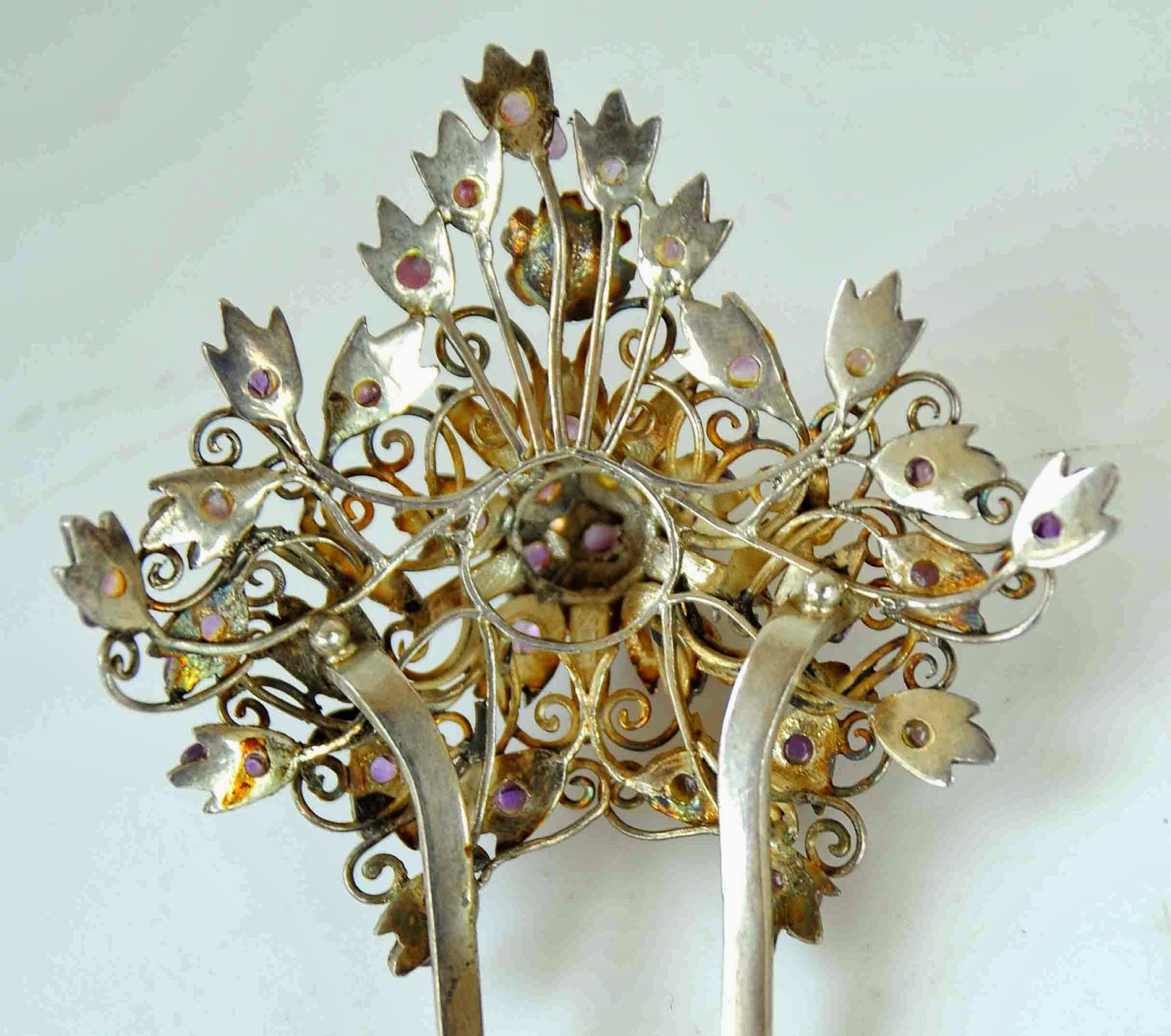 Tusuk konde ini dibuat dari bahan perak dengan kondisi masih cukup baik dan ada terdapat hiasan ornamen dari batu kecubung ungu, namun ada satu batu yang hilang pada salah satu tusuk konde sesuai yang terlihat pada gambar diatas yang diberi tanda anak panah berwarna merah.