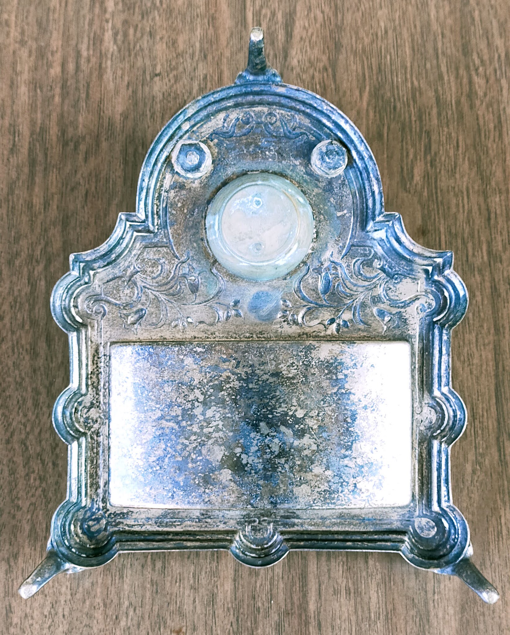Bahan kemungkinan terbuat dari alpaca berlapis perak, dan kaki-kaki pada tempat tinta terdapat gambar malaikat kecil atau cupid, dengan bagian permukaan wadah dihiasi gambar sulur dan bunga. Sungguh terlihat cantik dan sangat berkelas.
